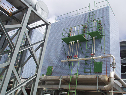 杭州藍星環保設備有限公司的脫硫裝置用瓷磚飾面,可與廠房格調相一致,成為企業內部的一道風景線。